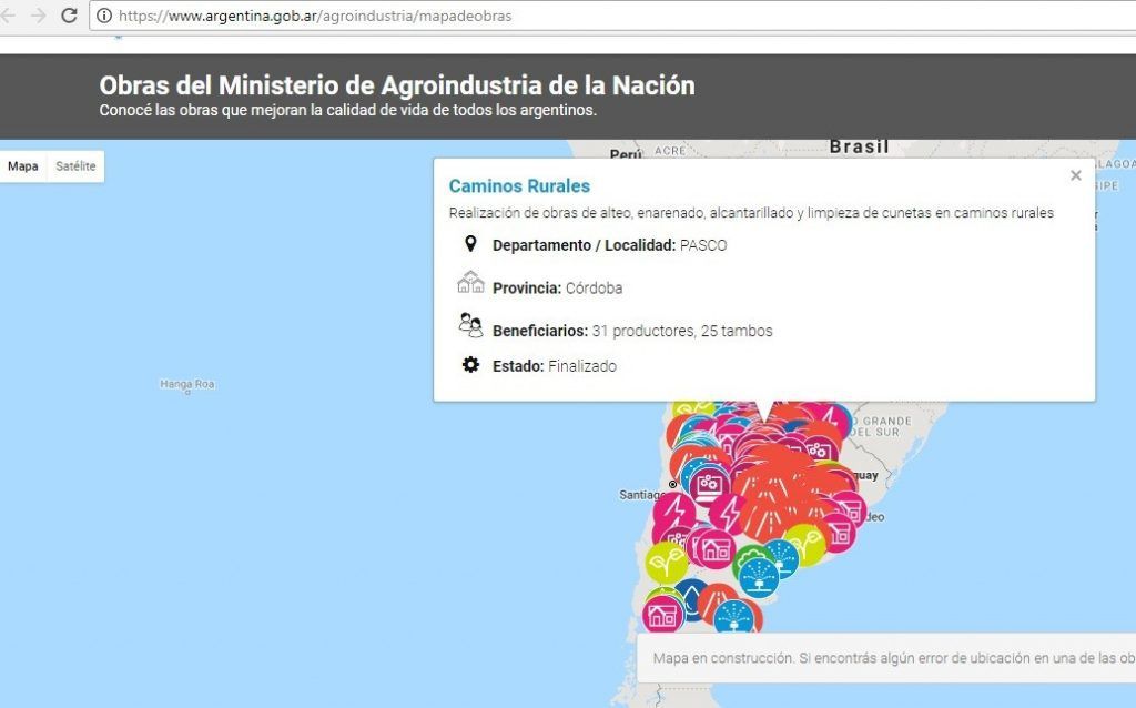 El Ministerio de Agroindustria de la Nación a través de la Secretaría de Agricultura Familiar, Coordinación y Desarrollo Territorial, presentó la plataforma digital de infraestructura desarrollada con información de obras en 22 provincias. El mapeo es de actualización constante y se encuentra disponible en la web del organismo. En el compromiso del gobierno nacional de