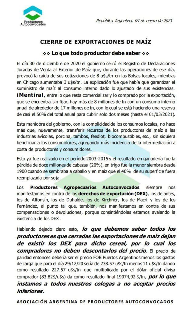 Mediante el comunicado expresan que «siempre estuvieron en desacuerdo con los Derechos de Exportación, los de Alfonsín, los de Duhalde, los de Kirchner, los de Macri y los Fernández» aclarando que ya se expresaron con protestas por las compensaciones a las retenciones de menores productores.