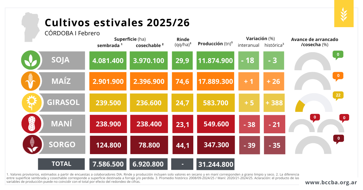 La falta de lluvias en el sur provincial condiciona los rendimientos de la campaña estival. Según un informe de la Bolsa de Cereales de Córdoba, se estima una caída de 3 millones de toneladas respecto al ciclo anterior, mientras el maíz y el girasol logran sostenerse gracias a un aumento en la superficie sembrada.