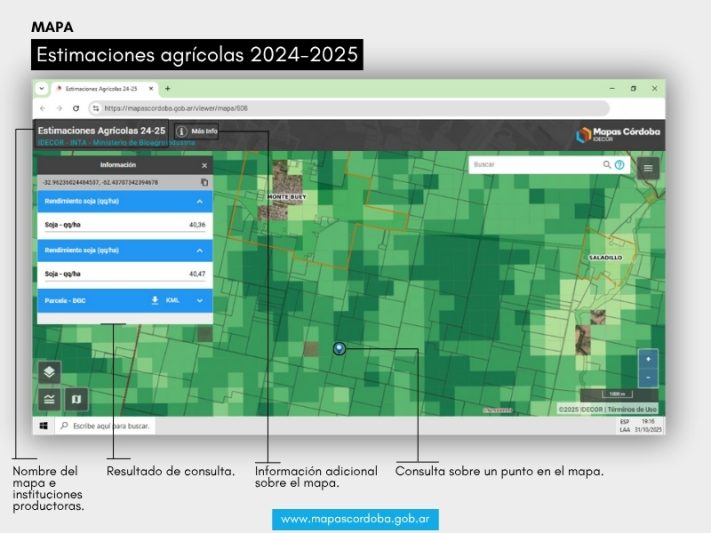 Un aspecto distintivo de estos estudios es el relevamiento de datos a campo. Para esta campaña, se recolectaron 1.021 observaciones georreferenciadas utilizando Rindes Collect, una herramienta desarrollada por IDECOR. Dellarossa enfatizó que el trabajo territorial realizado por las agencias zonales del Ministerio, que aportaron el 83% de los datos, es la base para construir información de calidad que transforma la realidad productiva de Córdoba en conocimiento útil para el desarrollo agropecuario sostenible.