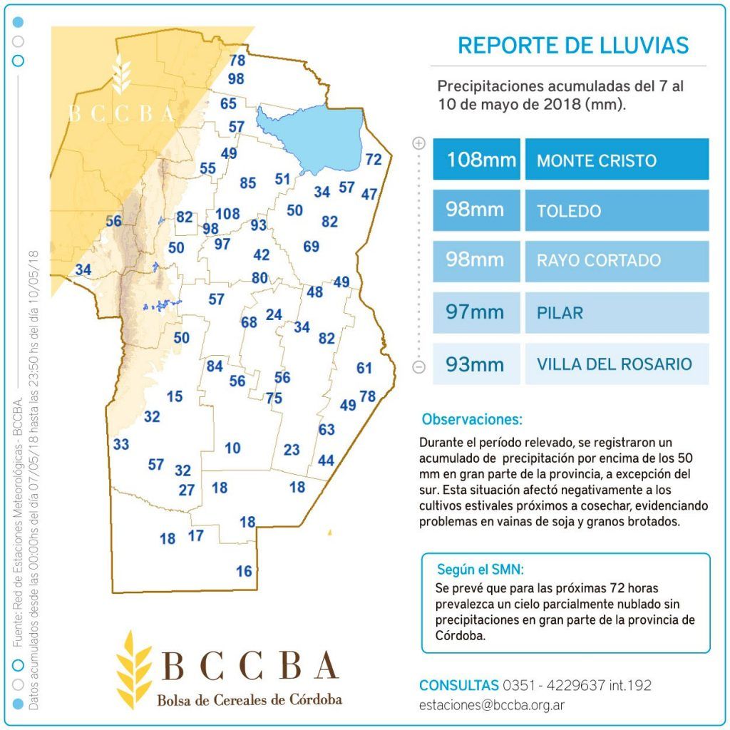 La Bolsa de Cereales de Córdoba brindó el reporte de Precipitaciones registrados en la Provincia de Córdoba. El acumulado entre los días 7 al 10 de mayo, marcan registros superiores a los 50 mm, salvo en el sur del territorio cordobés. Estas precipitaciones afectaron principalmente a los cultivos estivales a cosechar, especialmente en soja, evidenciando problemas en la vaina y en granos brotados.