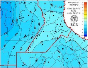 Este martes 24 de julio, la región núcleo permaneció sumergida bajo los cero grados entre 8 y 9 horas en promedio. Tras sucesivas escalas descendentes, las temperaturas alcanzaron su punto más bajo. El centro de alta presión acompañado de la masa de aire frío y seco que ingresó el sábado 21, barrió con el mal tiempo, pero llevó los termómetros a su nivel más bajo del 2018.