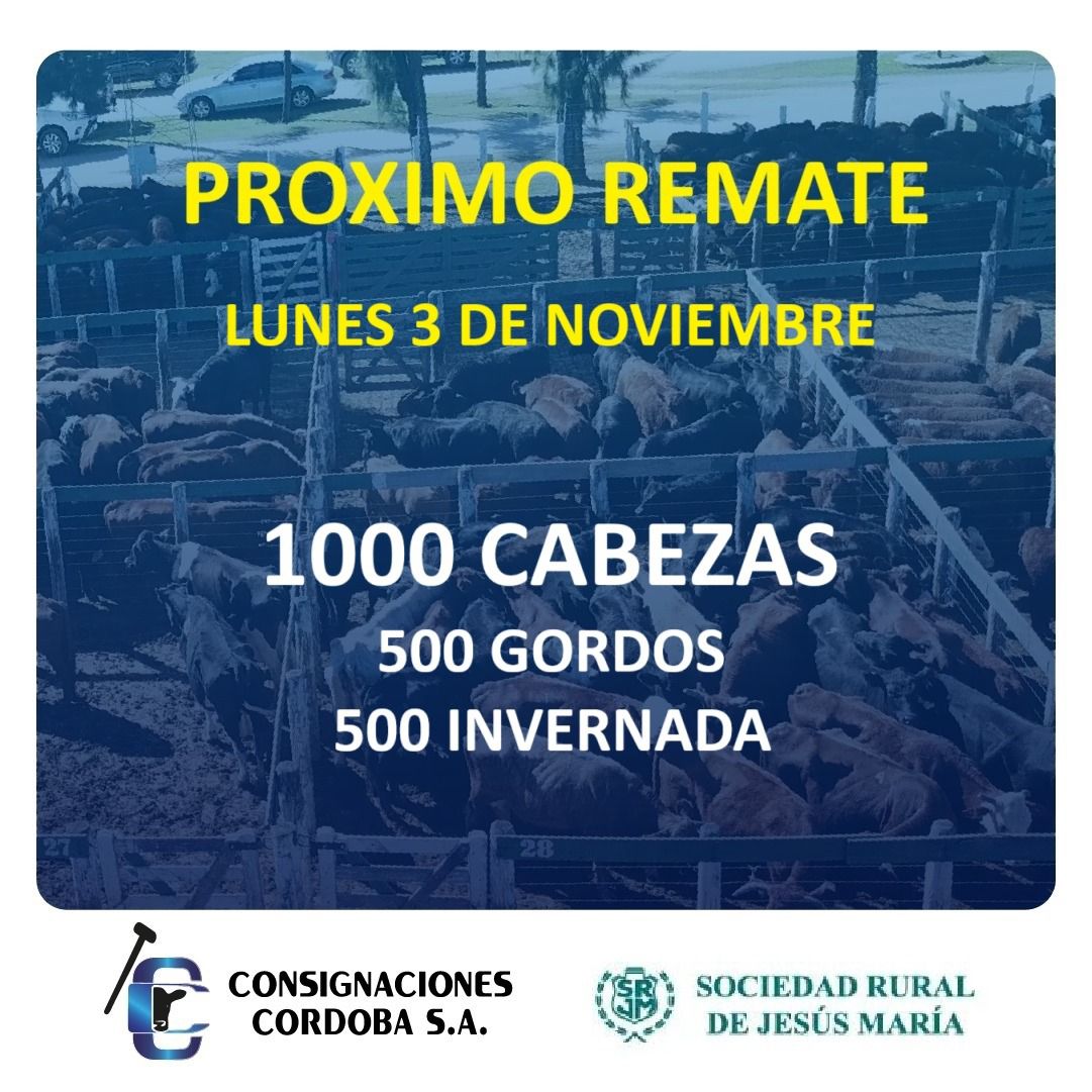Con un ingreso de 1.000 cabezas, Consignaciones Córdoba realizará su tradicional remate de hacienda en la Sociedad Rural de Jesús María. Este lunes 3 de noviembre se subastarán 500 animales destinados a faena y 500 terneros de invernada.