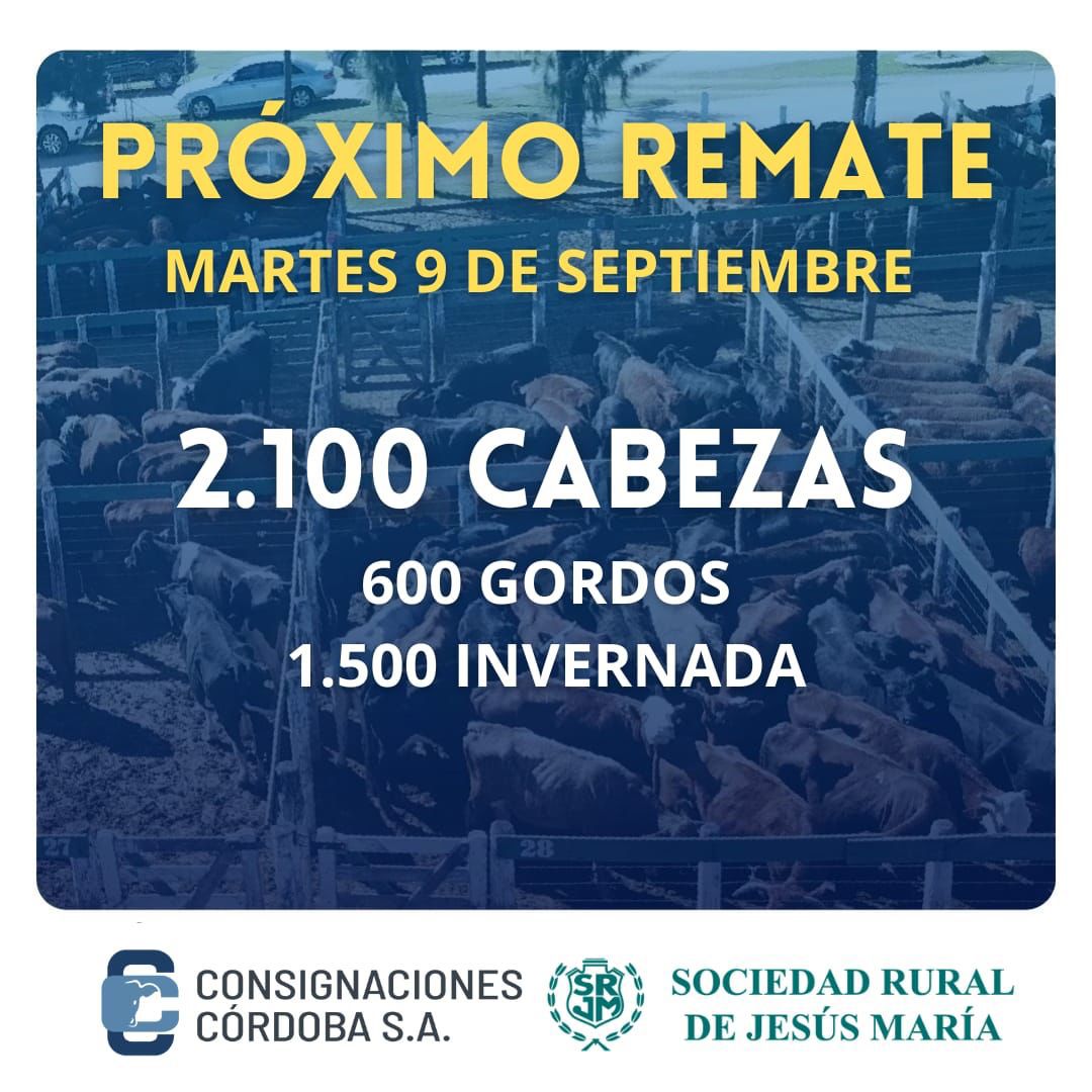 Con un ingreso de 2.100, Consignaciones Córdoba realizará este martes 9 de setiembre, el tradicional remate de hacienda en la Sociedad Riural de Jesús María. La subasta pasó al martes tras la realización de la Exposición Rural de Jesús María.