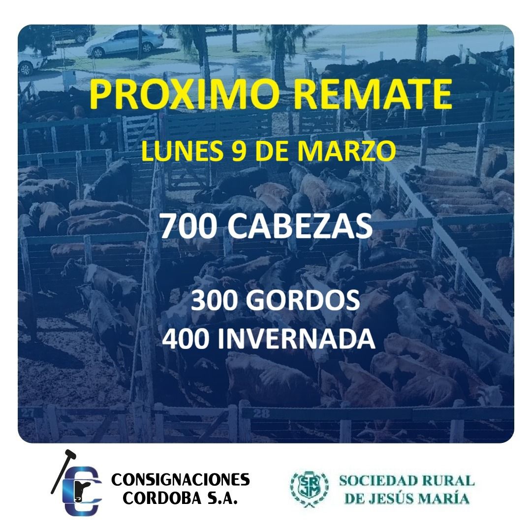 Consignaciones Córdoba anunció su próximo reunión ganadera en la Sociedad Rural de Jesús María. Será este próximo lunes 9 de marzo, desde las 10 de la mañana, con una oerta de 700 cabezas.