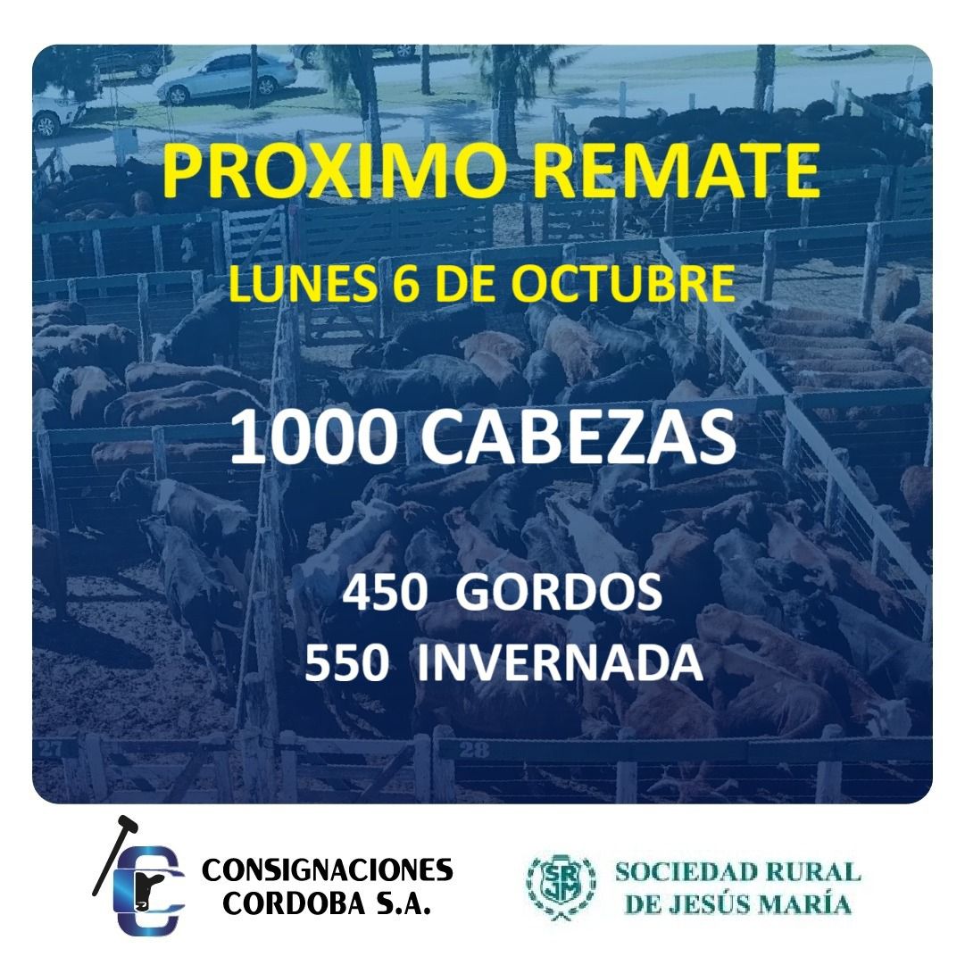 Con una oferta de 1.000 cabezas, Consignaciones Córdoba anuncia su nuevo remate de hacienda en la Sociedad Rural de Jesús María. Este lunes 6 de octubre, desde las 10 de la mañana, se venderán 450 animales gordos con destino a faena, para posteriromente subastar 550 terneros de invernada.