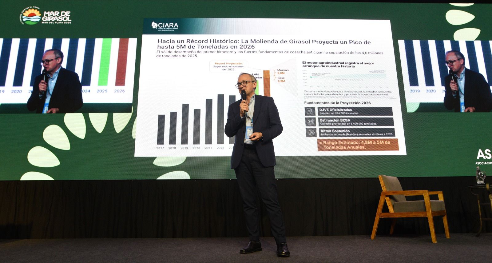 Por su parte, Ramiro Costa, de la Bolsa de Cereales, proyectó que, de eliminarse las retenciones, la tasa de crecimiento de la producción de girasol saltaría de un 6% a un 20% anual. Este crecimiento estaría respaldado por un contexto internacional donde el girasol es el «gran ganador», con una demanda global de aceite que crece por encima de la media de otros aceites vegetales.