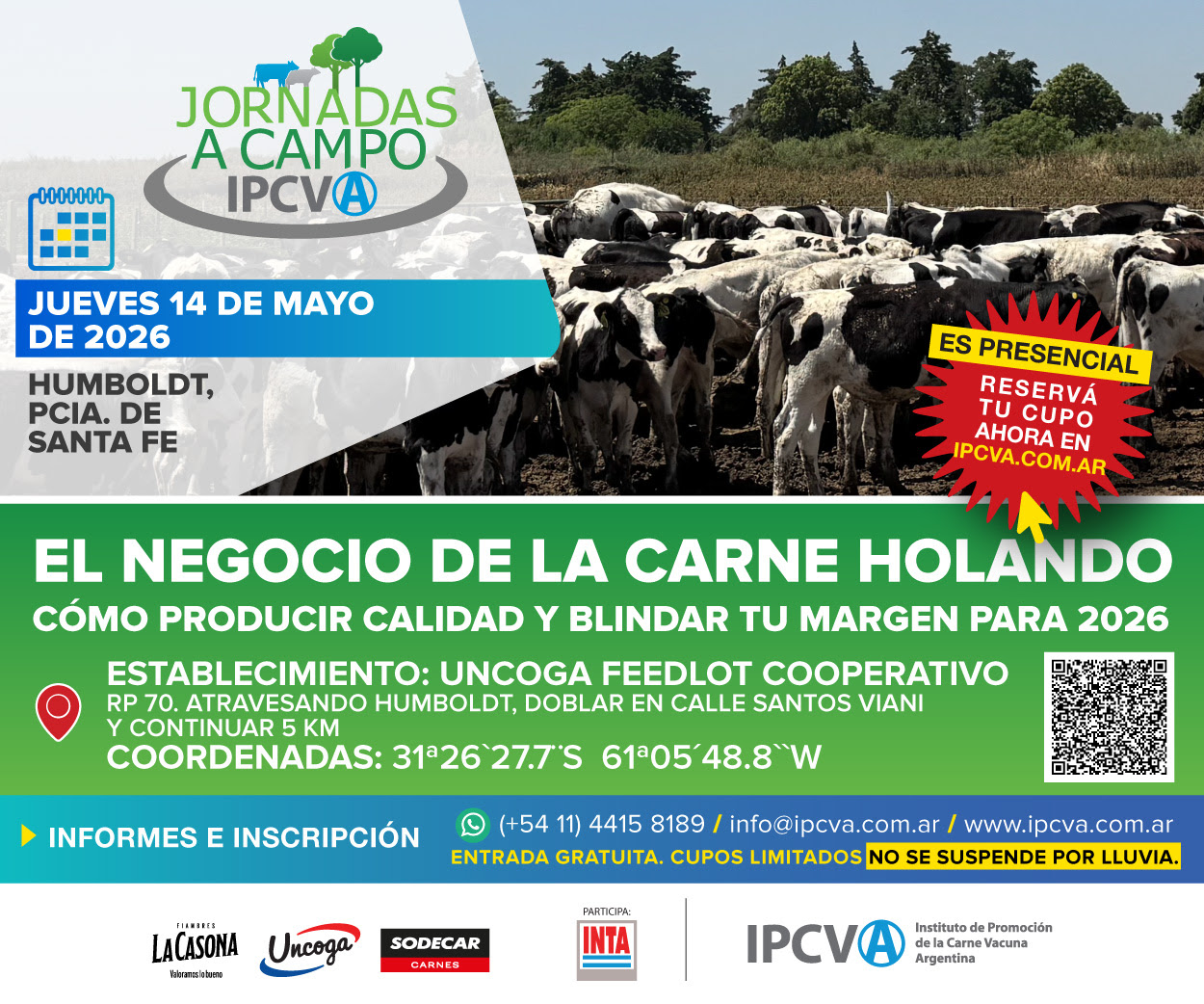 La ganadería argentina se encamina hacia un proceso de modernización acelerado por las exigencias de los mercados internacionales y la necesidad de optimizar la eficiencia productiva. En este contexto, el Instituto de Promoción de la Carne Vacuna Argentina (IPCVA) organiza una nueva Jornada a Campo titulada “El Negocio de la Carne Holando, cómo producir calidad y blindar tu margen para 2026”. El encuentro tendrá lugar el 14 de mayo en el Establecimiento UNCOGA Feedlot Cooperativo, ubicado en las cercanías de Humboldt, Santa Fe.