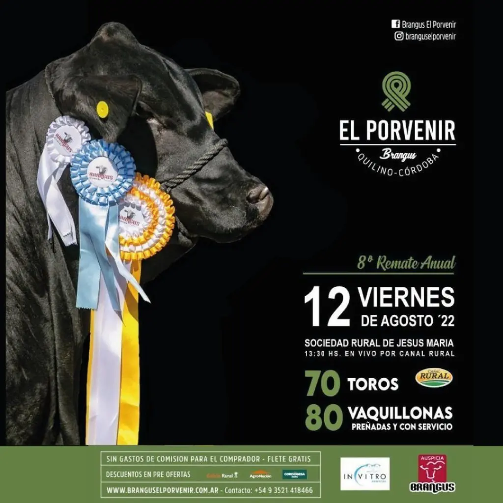 El remate presencial en instalaciones de la Sociedad Rural de Jesús María, que será transmitido por Canal Rural, contará con ventajas especiales para quienes sean compradores. Cabaña El Porvenir, viene de cumplir una activa participación en la Exposición Rural de Palermo, donde obtuvo premios y distinciones importantes. Entre ellas se destacan: Campeón Vaquillona Mayor y 3° Mejor Hembra Raza Brangus – El Porvenir 9739 Morenita Francesco T/E “Trigueña”, Campeón Ternera Mayor – El Porvenir 10406 Sorpresa T/E, Res. Campeón Vaquillona Mayor – El Porvenir 9718 Hemingway T/E “Roma” en co-propiedad con Cabaña Doña Evangelina de Grupo LMR, entre otros.