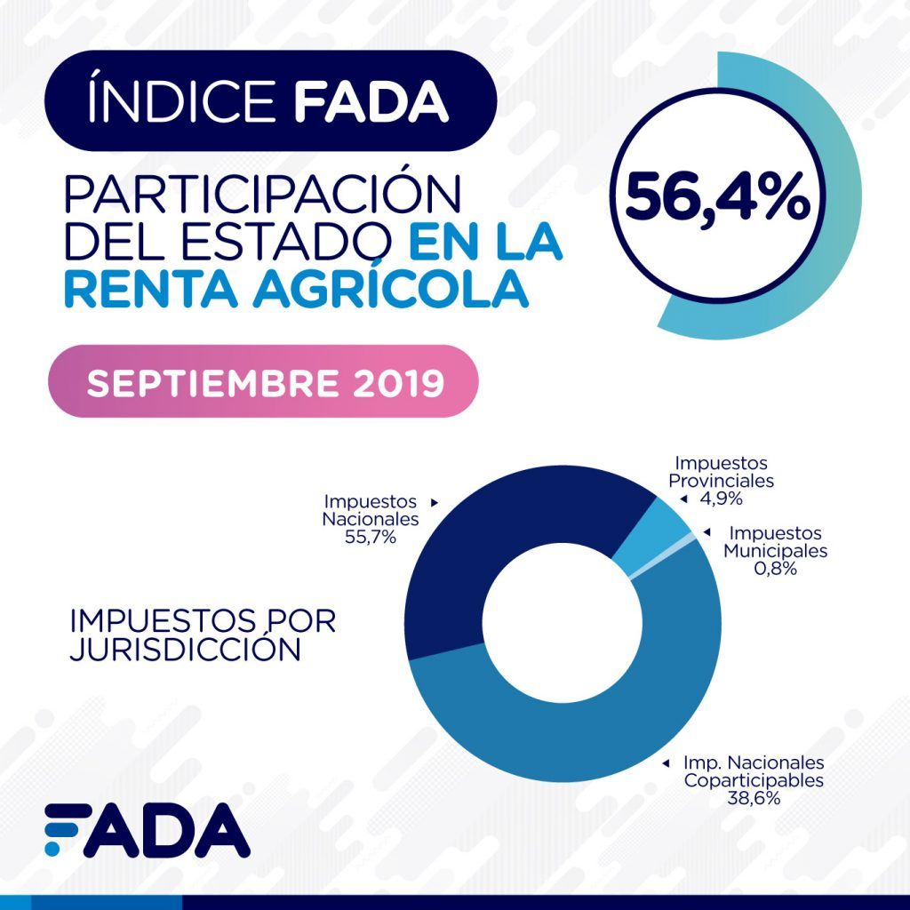 La medición de septiembre 2019 reveló que el 56,4% de la renta agrícola se distribuye en distintos niveles del Estado. Es decir que, de cada $100 que genera el campo, $56,4 van a los gobiernos: municipal, provincial o nacional. En este estudio, la renta es entendida como el resultado del valor de la producción menos los costos.