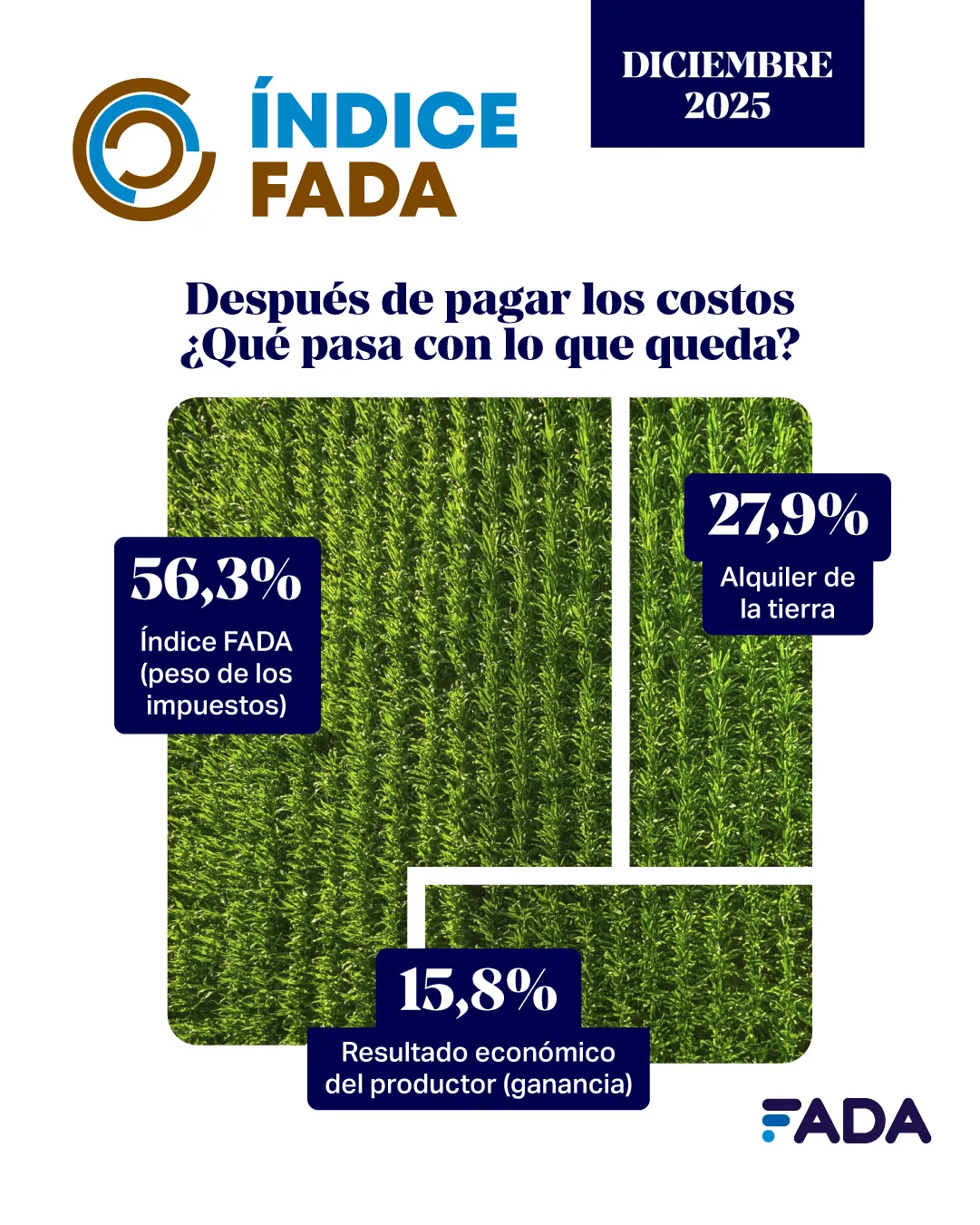 El Índice FADA (Fundación Agropecuaria para el Desarrollo de Argentina) ha comenzado a reflejar la baja permanente de las Retenciones o Derechos de Exportación (DEX) anunciada en diciembre, situando el peso de los impuestos en la renta agrícola en un 56,3%. Aunque la disminución de impuestos se traduce en una mayor producción, más empleo y un impulso al consumo que «moviliza la economía», según Antonella Semadeni, Economista FADA, el peso impositivo continúa siendo elevado.
