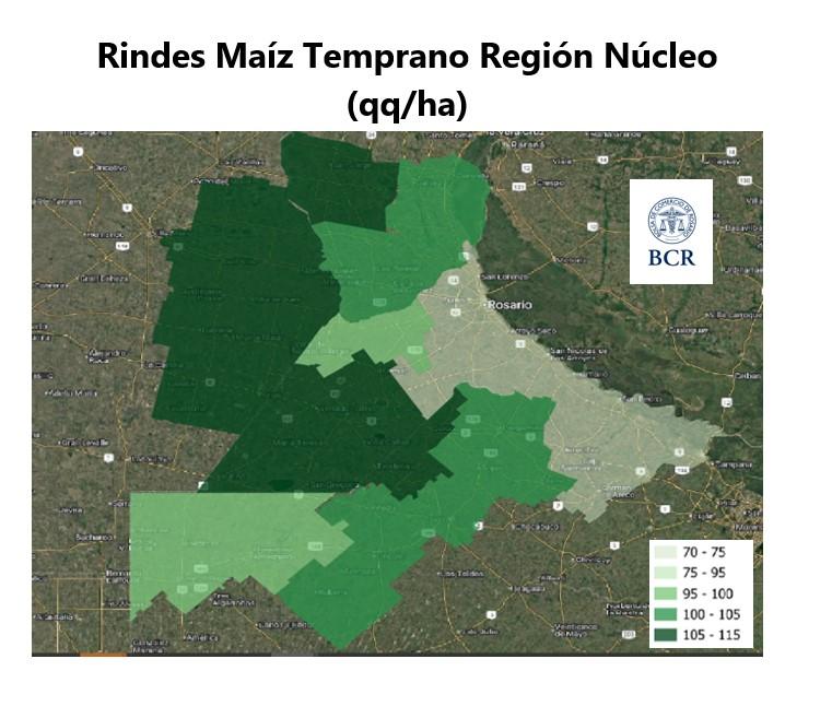 La distribución de los rindes refleja dos realidades contrastantes. Mientras que en el oeste de la región los rindes superan con comodidad los 105 qq/ha, beneficiados por un mejor régimen de lluvias, la franja este muestra el impacto de la escasez hídrica. En zonas aledañas a Rosario y hacia el sur, específicamente en el departamento Constitución, los registros caen a valores de entre 70 y 80 qq/ha.