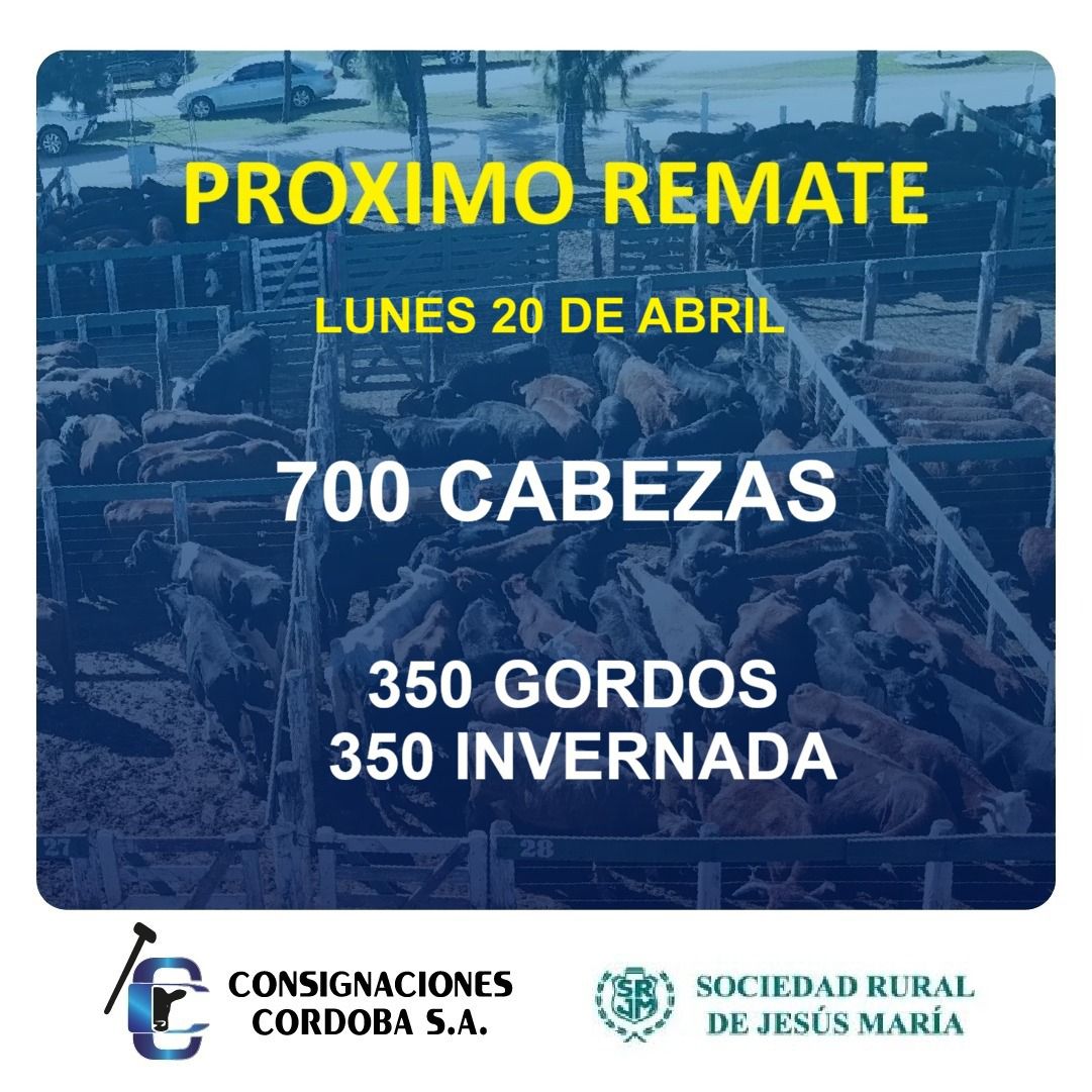 Con un ingreso de 700 cabezas, Consignaciones Córdoba concretará este lunes 20 de abril su habitual remate de hacienda, en la Sociedad Rural de Jesús María. Según lo anunciado por la empresa consignataria, habrá oferta de gordos e invernada.