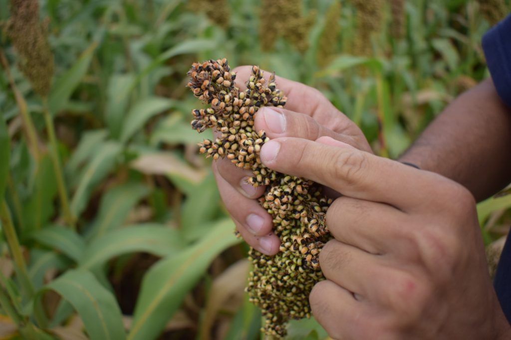 El proceso en el trabajo de producción que realiza Oscar Peman Semillas en el lote de Sinscate, arranca cuando los técnicos sembraron machos y hembras con la genética BMR. En el campo, pueden observarse plantas más altas (los machos) y las bajas y con panoja de mayor volumen (las hembras). Ambos poseen la característica de mayor digestibilidad. Los granos de las panojas más grandes serán polinizadas. En el campo se siembra un 75 % con hembras y un 25 % de machos.