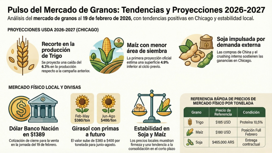 La reciente jornada en los mercados agrícolas estuvo marcada por la publicación del informe de perspectiva del Departamento de Agricultura de los Estados Unidos (USDA). Este documento reveló las primeras proyecciones oficiales para la campaña 2026-2027, generando movimientos significativos tanto en la Plaza de Chicago como en el mercado físico local.