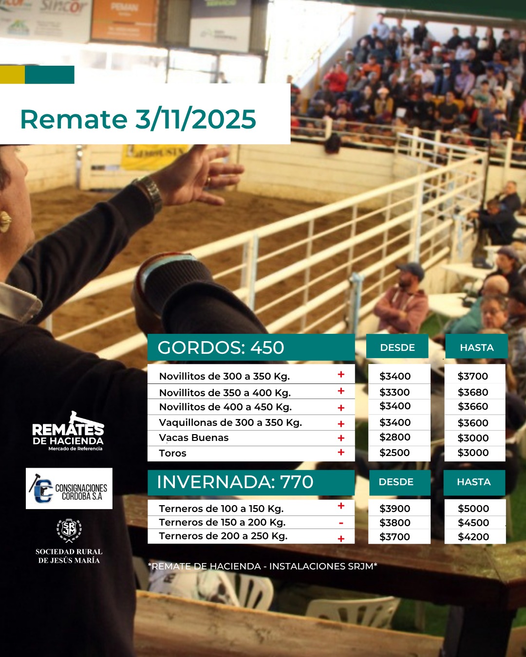 Con un ingreso de 1.220 cabezas, Consignaciones Córdoba concretó su tradicional remate de hacienda en la Sociedad Rural de Jesús María. En total se vendieron 450 gordos con destino a faena y 770 terneros de invernada.